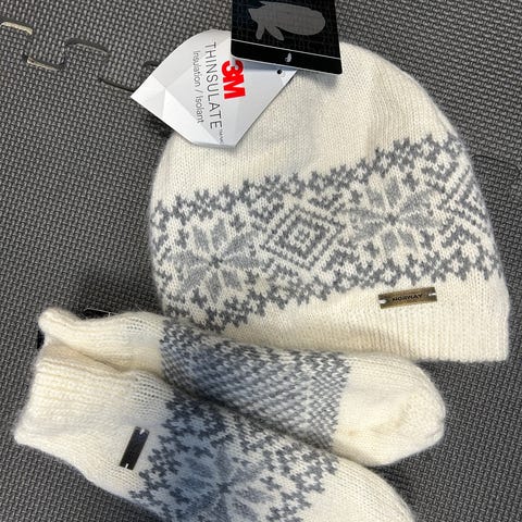 Selger ett nydelig sett med lue og langt godt sjalu acryl. Fargen er sort og hvitt. Deilig no til vinteren. Begge deler er lite brukt,somnytt. Merket er Indiska.