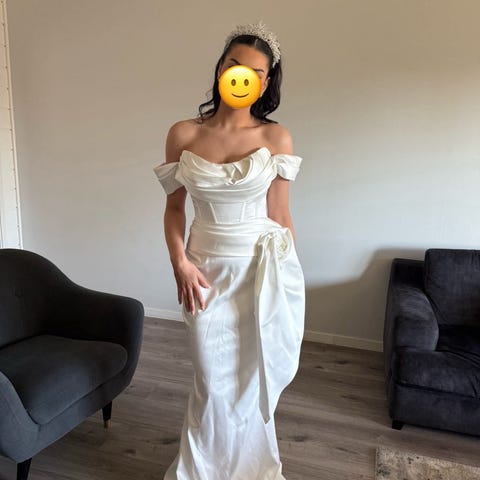 Kjøpte den ifjor fra brudekjole butikk i oslo. Den er størrelse 36, har syd den inn, høyden min er 153 og jeg brukte sko med 5 cm hæl. Jeg selger også slør som er samme lenge som kjole.