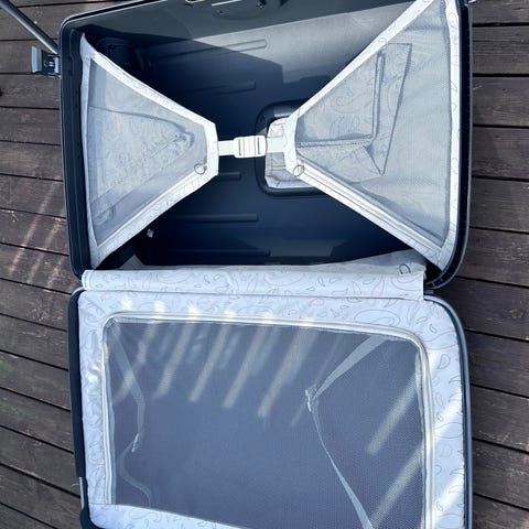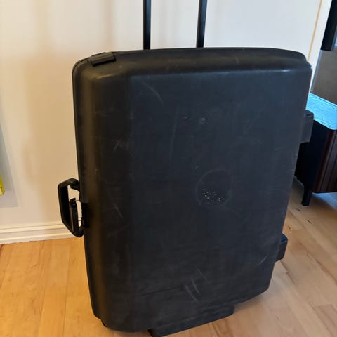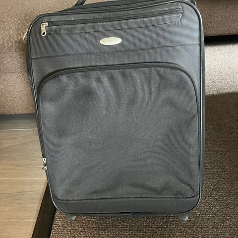 Praktisk svart Samsonite trillekoffert med flere lommer og hjul selges. Hempen til glidelåsen på den minste lommen er delvis borte, men den går å lukke og åpne for glidelåsen fungerer som normalt. Hempen kan sikkert byttes om ønskelig. Stor, fin koffert som kostet mange tusen når den ble kjøpt.