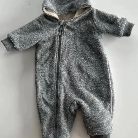 Herlig myk heldress med stripete lang hette, lomme og treknapper Str 68.