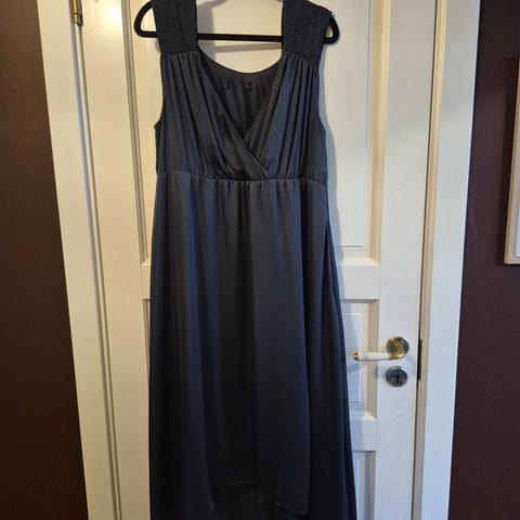 Lekker selskaps kjole fra KappAhl i svart farge med side glidelås, fine detaljer. 97% bomull , 3% elastan. Lengde ca 98 cm, brystmål mellom ermene ca 46 cm