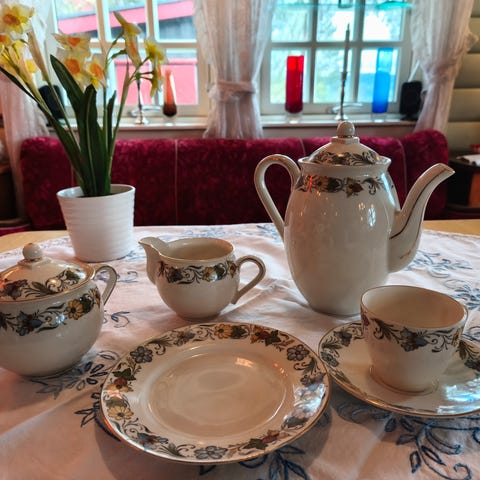 Serviset består av kaffekanne, fløtemugge, sukkerkopp og 6 kuverter kopp/skål/asjett.