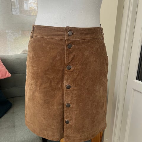 Lekkert, tettsittende nappaskinn skjørt. Lengde litt over kneet. Som nytt! Veldig pent sydd. Topp kvalitet. Ny pris ca kr 2500.