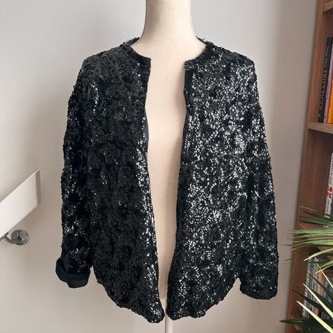Fin paljett jakke med små perler i gylden brun/gull og svarte paljetter. Svart stoff. Gjennomsiktig, tung kvalitet