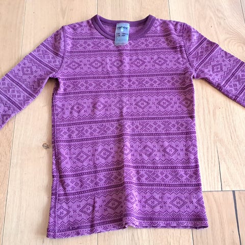 Pen skolegenser. 80 % bomull, 20 % polyester. Lomme på magen. Str 140.