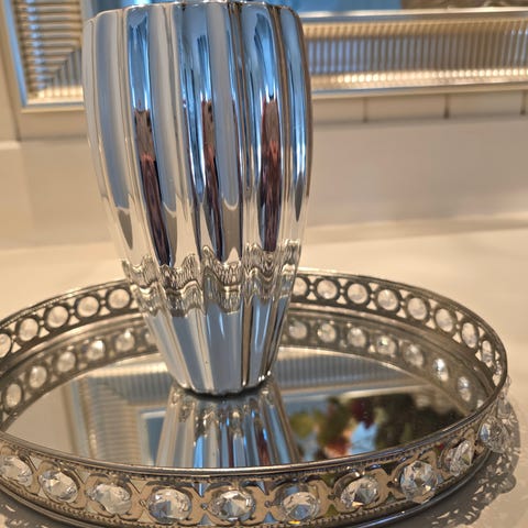 Fat lengde 47 cm , Bredde 34 cm . Høyde på vase 17 cm