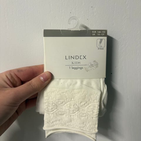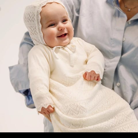 Hvit med hjerter I stoffet og blondekanter. Liten rose i halsen og begge armer.