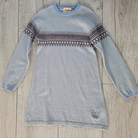 74cm fra halsen og ned. Strikket i Lerke garn fra Dahle. Nydelig kjole.