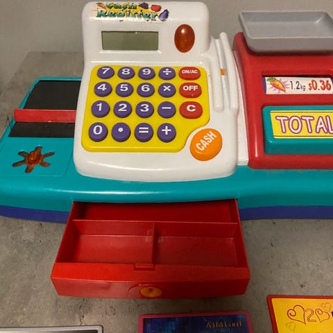 Fin brukt leke kasse apparat med skanner, mikrofon og høytaler.