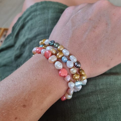 Nye håndlaget armbånd av fargerike perler. Kan pakkes inn som gaver.