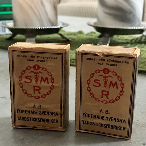 Fyrstikkeske i metall med Mora/Dalarna trykk. 4,5x2,8 cm.
