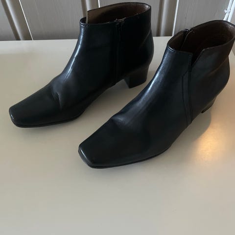 Dette er noen råstilige skoletter i sort skinn. Skolettene er smale og sitter flott på foten. De har 7 cm høy hæl og er spisse foran på foten. Hel lengde på skoletten er 20 cm.