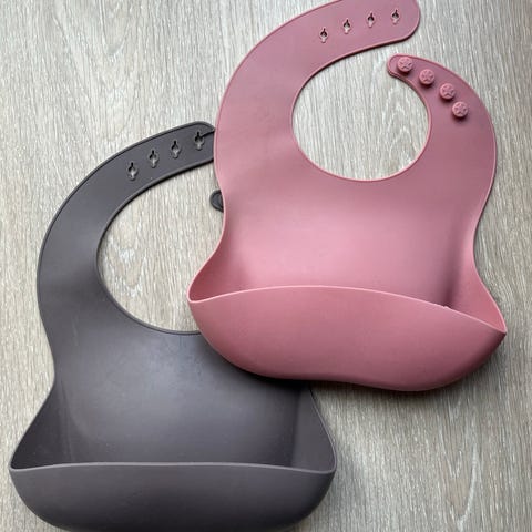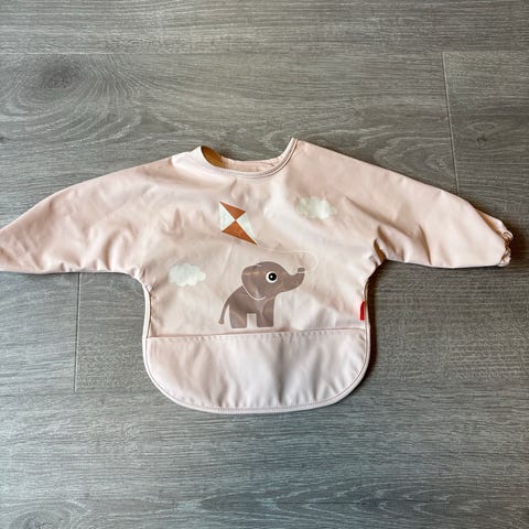 Praktisk silikonsmekke med matoppsamler. Silikon er slitesterkt og er enkelt å tørke av eller vaske i oppvaskmaskinen. Smekken er myk og komfortabel for de små å bruke, har justerbar nakkestropp.