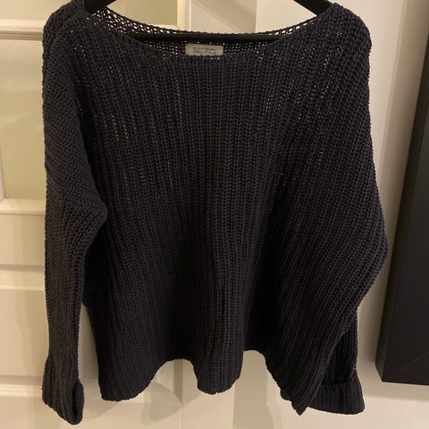 Tøff og varm mørkeblå flettestrikket ullgenser fra Turnover (Nederlandsk merke). Oversized modell, faller fint, litt lengre bak enn foran.