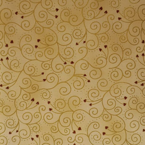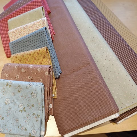 Selger en pakke med nydelige julestoffer i gyllen, rødt og sort, med gull. Ren bomull, quiltestoffer, de fleste fra Hoffmann.