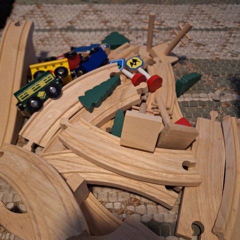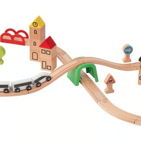 Dette settet har alt som trengs for å bygge et togspor med kurver, broer, tunneler og barrierer.