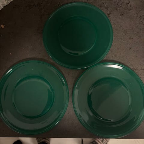 Selger 9 skr sjøgrønne dekketallerkner på 28cm i serien Fest. Designet av Willy Johansson for Hadeland Glassverk. Noe bruksmerker på de fleste. 150kr stk.