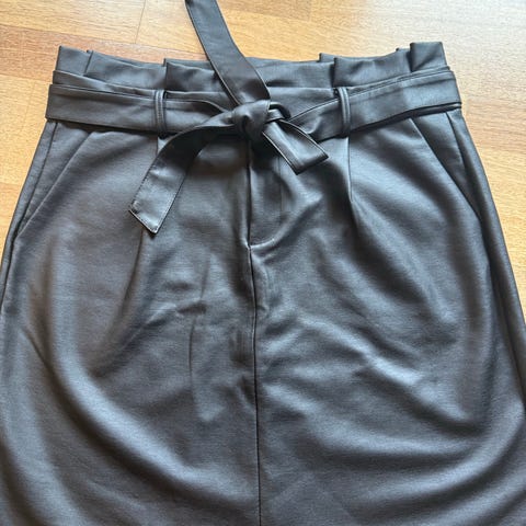 Allsidig svart skjørt! Skjørtet har høy midje med belte, dobbeltspent knappedetalj og en flatterende A-linje silhuett 💐