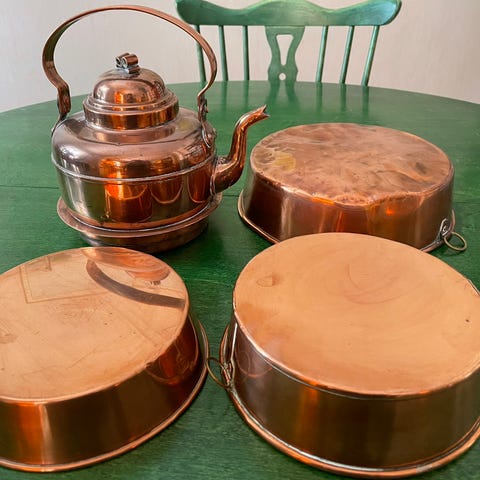 Tre kaffekjeler i kobber selges. Den minste er merket Røros Kobberverksted. De to 3-bens kjelene er uten merking. Høyde liten kjele er (eks hank) 15 cm. Den høyeste 3-bens (m. lokk på tut) er 26 cm. Den andre 3-bens er 24 cm høy. Sendes. Frakt legges til prisen. Prisen er for alle.