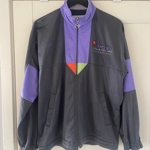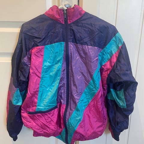 Utrolig kult mønster, lilla, grønn, gul, sølv. Uten hette.