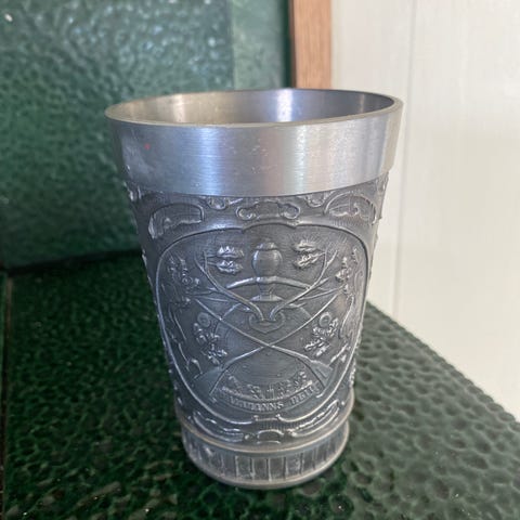 I brukbar stand. Har bulker og to riper ved bunnen. Godt laget håndekor og årstall. Stemplet i bunnen. Klarer ikke helt lese stemplet men det er 4 stor bokstaver. 9.5cn høy og 7.5cm i diamenter på det bredest.