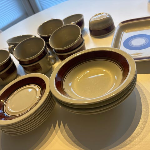 8 hele (kaffe)kopper m/ asjett: 60,- per sett.