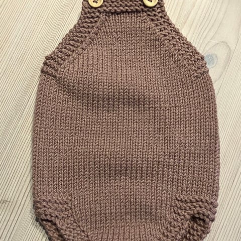 Nydelig hjemmestrikket romper i str ca 1 mnd. Strikket i DSA «Sterk», 40% alpakka, 40% merinoull og 20 % nylon. Fargen heter gullgul, litt vanskelig å få fram riktig farge.