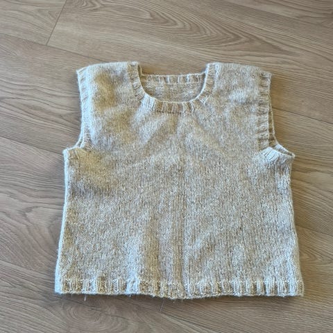 Strikket grå vest i Du store Alpakka garn STERK. Målene er fra skulder og ned ca 50 cm.