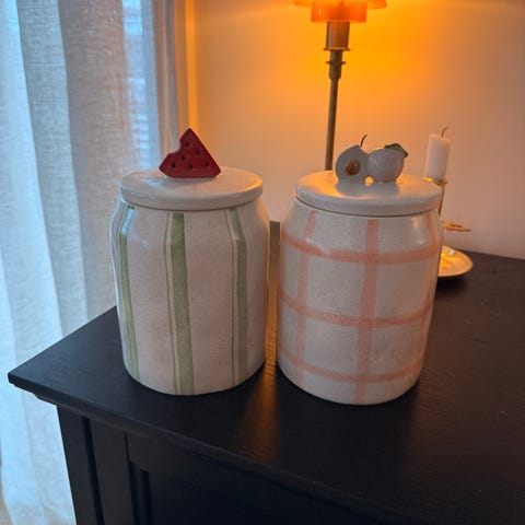 Store oppbevaringskrukker fra Ikea. Høyde: 18 cm. Diameter i åpningen: 9 cm.