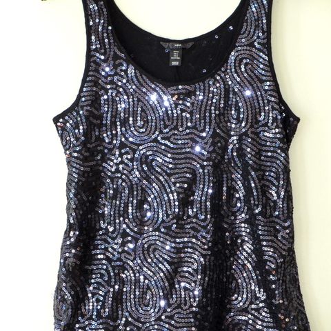 Sort topp med paljetter i 100% rayon, str M, brukt en gang, selges kr 200,-