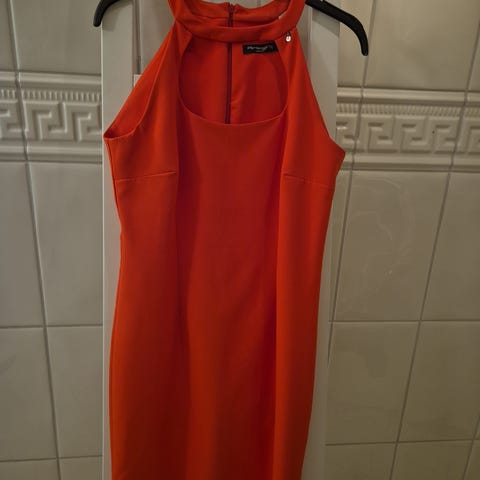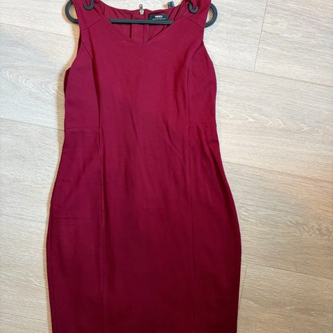 Fin ny kort kjole og uten ermer rød kjole med sort dekor i halsen foran og bak. Står xl på størrelse men den er liten og tilsvarer str L