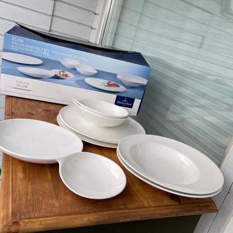 Firkløveren Ingrid 7 deler selges samlet for 700 kr . Kan sendes mot dekning av porto . 4 middag , 2 frokost , og 2 små skåler . Nytt i orginal emballasje . suppe tallerkner er solgt som viser på bildet . Kan sendes med p ost nord for 140 eller posten for 140 kr eller fiks ferdig . Kan hentes etter avtale .