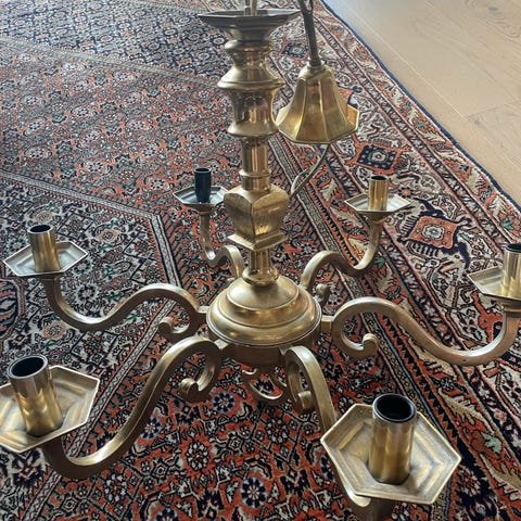 5 armer lysekrone lampe metal og glass i god stand ikke dimmer, følger med lysepærer, kan kjøres nærmete i Lillestrøm eller Oslo