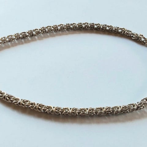 Håndlaget kongekjede i sølv på 100g. Det er nå 61,5 cm langt, men kan leveres i den lengde en måtte ønske. Taksten er på 7500,- kr.