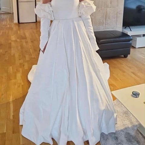 Vakker og sjelden off skulder brudekjole vurderes å selges. Den sitter utrolig lekkert på med nydelige detaljer i stoff, rygg og brystparti. Den har lekre og glisende perler gjennomgående i hele kjolen og nydelige blonder i tyllet. Det er en lang korsett inni som gir en fin silhuett.