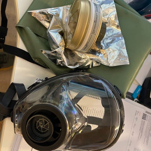 Perfekt maske mot gass og brann, kan ha i hus eller bil, til bruk ved røyk i tunnel, eller om du bor i rekkehus og blokk med mange leiligheter og etasjer burde en ha en sånn pr person. Filter og svensk bruksanvisning. SENDES VIPPS 2300 +140