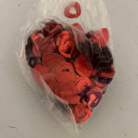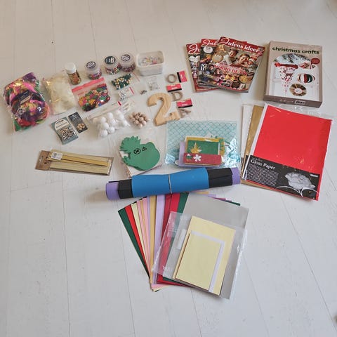 Lite hobbysett med papp og dekor (blomster, hjerter og marihøne. Klipt ut en liten bit av pappen, ellers ikke brukt.