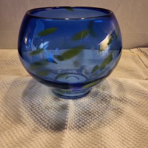 Rund, men flat. Klart glass nederst og en nydelig blåfarge øverst.