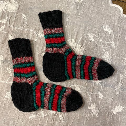 Jeg selger disse nye, rød/hvite mønstrede, tykke , hjemmestrikkede ullsokkene/ulltøflene for kr 350,- Passer til en som bruker 37 i sko. Se mål på bilder.
