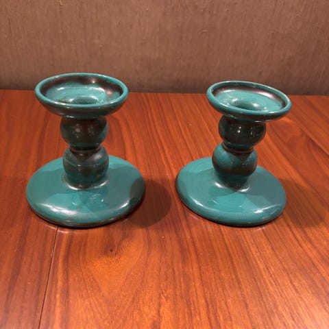 2 stk. Grønne lysestaker med «gullkant» dekor. Passer til vanlige stearinlys. Høyde 21 cm. Dia fot 11 cm. Kjøpt 1990’s. Lite brukt med sjarmerende patina stearinlys. God stand. Selger kr.100,-/Stk. Tar vipps. Sender + porto Norgespakke 76/PostNord 69.