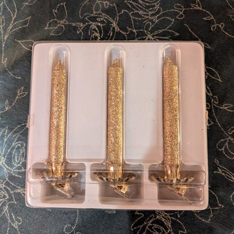 Pakke med 2 dekorasjonslys med «gull». Lengde: 38 cm. Dia: 3,5 cm. Brennetid: ca 23 timer. Fullrafinert spesialvoks. Se Deklarasjon bilde. Ikke åpnet. Har 3 stk. uåpna pakker. Selger kr.100,- pr/pakke. Pris er satt. Sender + porto Norgespakke/PostNord 69.