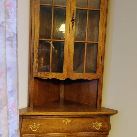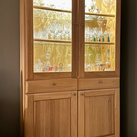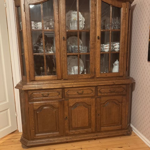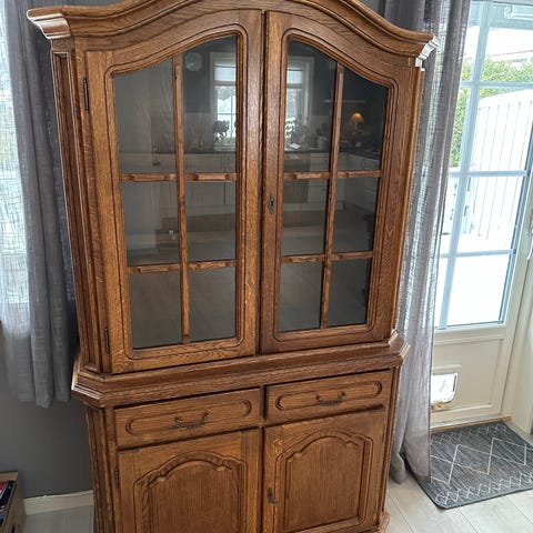 Flott skap i eik med glassdører selges grunnet flytting. Skapet er 2.meter høyt, 40.cm dypt, underdelen er 75.cm bred. Har en skuff i underdelen. 4 hylleplater i skapdelen. Skapet er i 2.deler(overdel/underdel)Beiset eik. Fint å male hvis du ønsker annen farge.