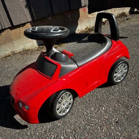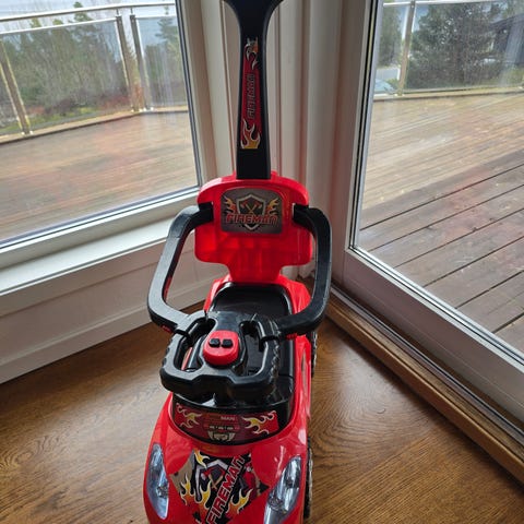 Gåbilen rød til dei minste sjåførene. Bilen har tute og praktisk oppbevaring under sete. Voksen kan styre bilen med håndtaket. Fins noe bruksmerker.