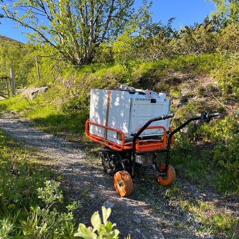 Godt motatt av ny kundegruppe. En kraftig elektrisk trillebår som drives av et lithium-ion batteri, den har differensial girkasse og 400W motor.