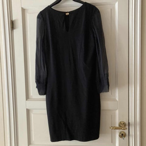 Pen kort stroppeløs kjole. Kremhvitt vidt skjørt med svart byste. Svart bånd som kan knytes rundt nakken eller henge ned som pynt. Lengde 80cm på den hvite delen