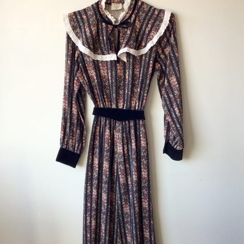 Ekte vintag kjole fra svenske Petri. Viskose. Strikk i livet. Størrelse ca 38, se mål under. Ikke foret. Meget pen. Lengde fra overkant skulder til skjørtekant ca 115 cm. Omkrets under armene ca 100 cm, liv ca 60-100 cm. Billigste porto. Se også mine øvrige annonser (trykk på min profil for å se annonsene).