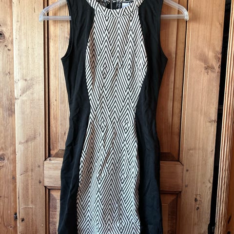 Kjole med artige detaljer, svart og sølv i skjørtet. Str. S, men kan nok brukes av M