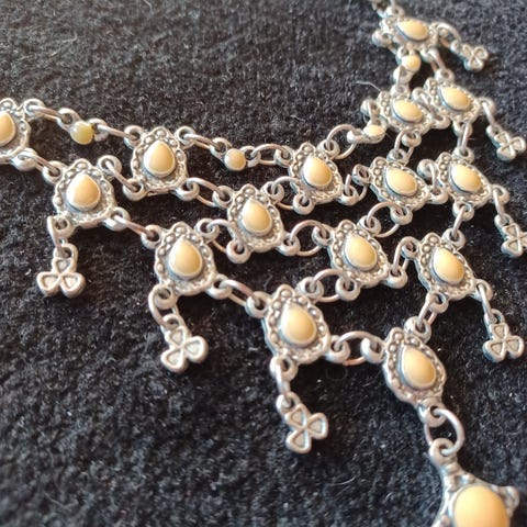 Vintage Aarikka smykke selges. I metall med hvite treperler. Langt kjede. 1960-tallet.