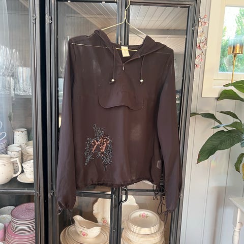 Unik topp i silke, lilla med kinesiske tegn og mønster. Du vil nok ikke møte noen med lignende:) Jeg har selv kjøpt den vintage og fikk vite at det var 100% silke. Selges fordi den dessverre har blitt for liten.