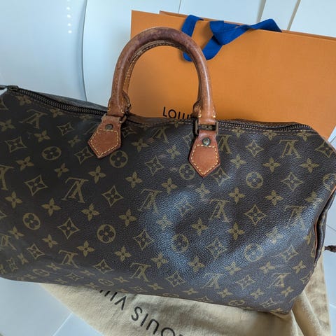 The handles and the piping are changed and covered by split leather and python. Both sides of the straps as the pull tabs are in python and natural leather.
